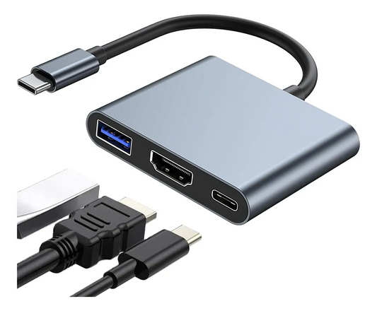 Adaptador 3 en 1 USB-C a HDMI 4K, USB 3.0 y USB-C PD 100W | Compatible con MacBook, Notebook y PC – Color Gris