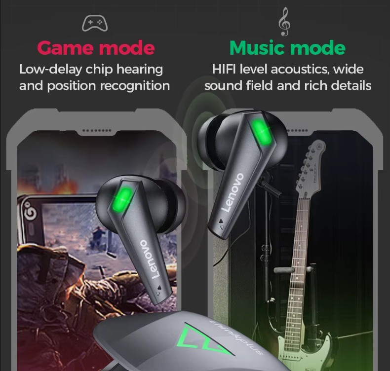 Audífonos Inalámbricos recargables de la marca Lenovo modelo XT85, cuenta con un diseño gamer, ofrece una Baja Latencia, Cancelación de Ruido y Micrófono Incorporado, ideal para escuchar la música que más te gusta o jugar videojuegos sin interrupciones y con la mejor calidad de sonido, igual cuenta con el modo dual de música/juegos.