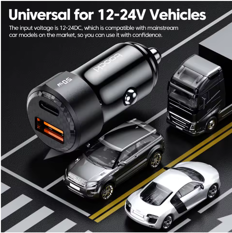 DespÃdete de los cargadores lentos y dale la bienvenida al Cargador de coche Toocki de 50W, tu nuevo copiloto de confianza. Ya sea que vayas al trabajo, de viaje o simplemente atrapado en el tráfico, este cargador ultrarrápido recarga tus dispositivos al ritmo de tu vida.
