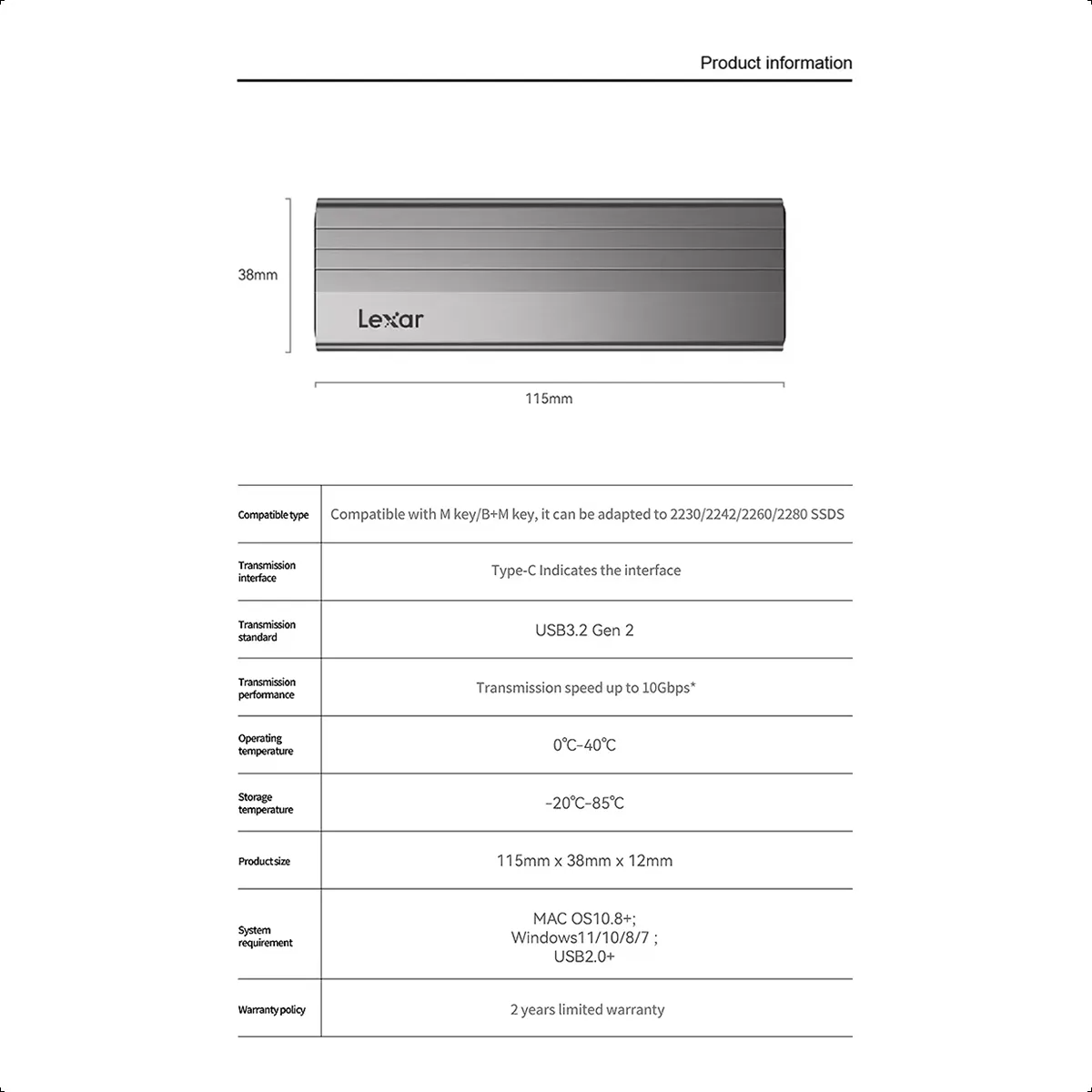 Convierte tu SSD M.2 NVMe en una unidad portátil de alto rendimiento con la Lexar E300. Diseñada con un cuerpo completamente de aluminio y conectividad USB Tipo-C, esta caja ofrece velocidades de transferencia de hasta 10Gbps, ideal para profesionales, gamers o usuarios exigentes.