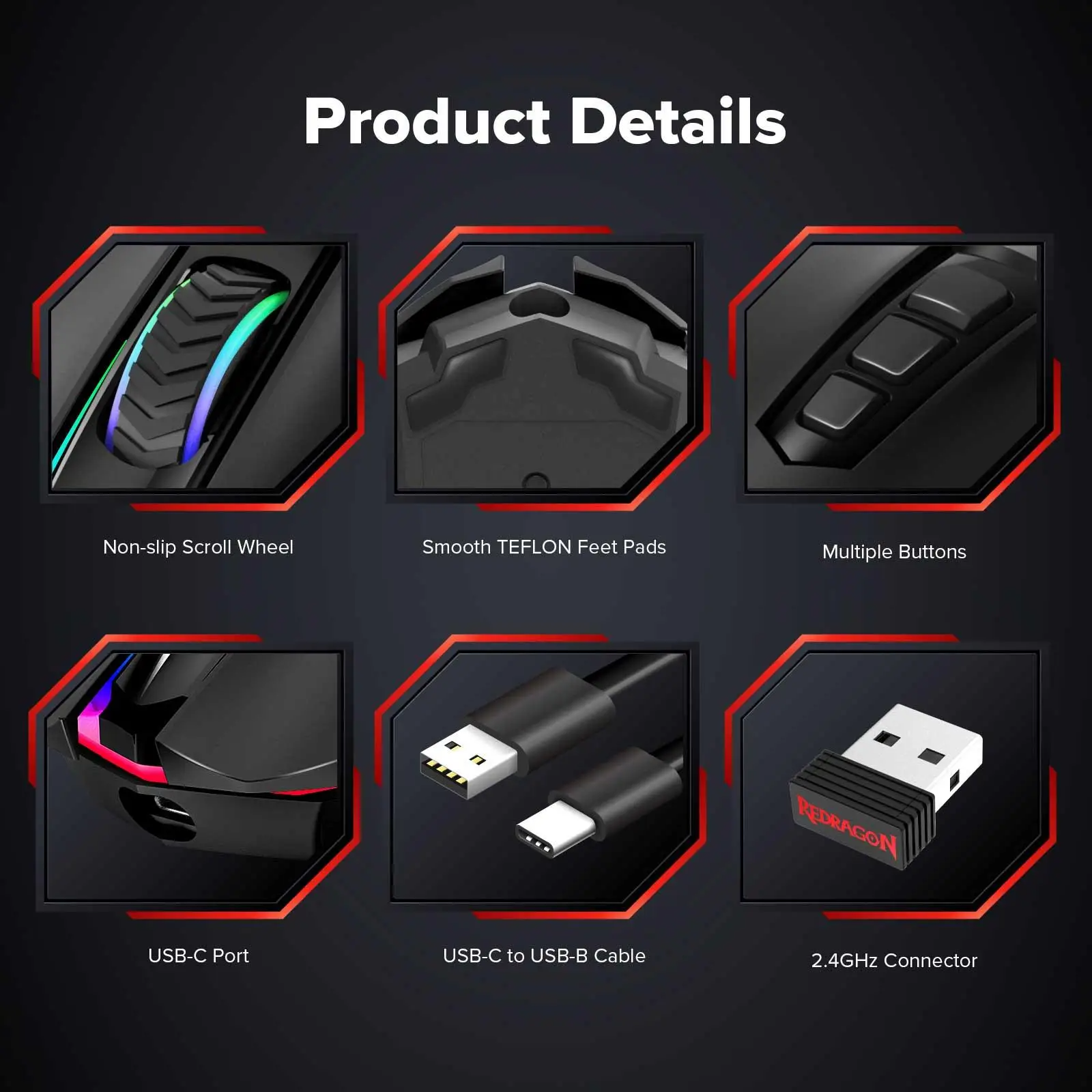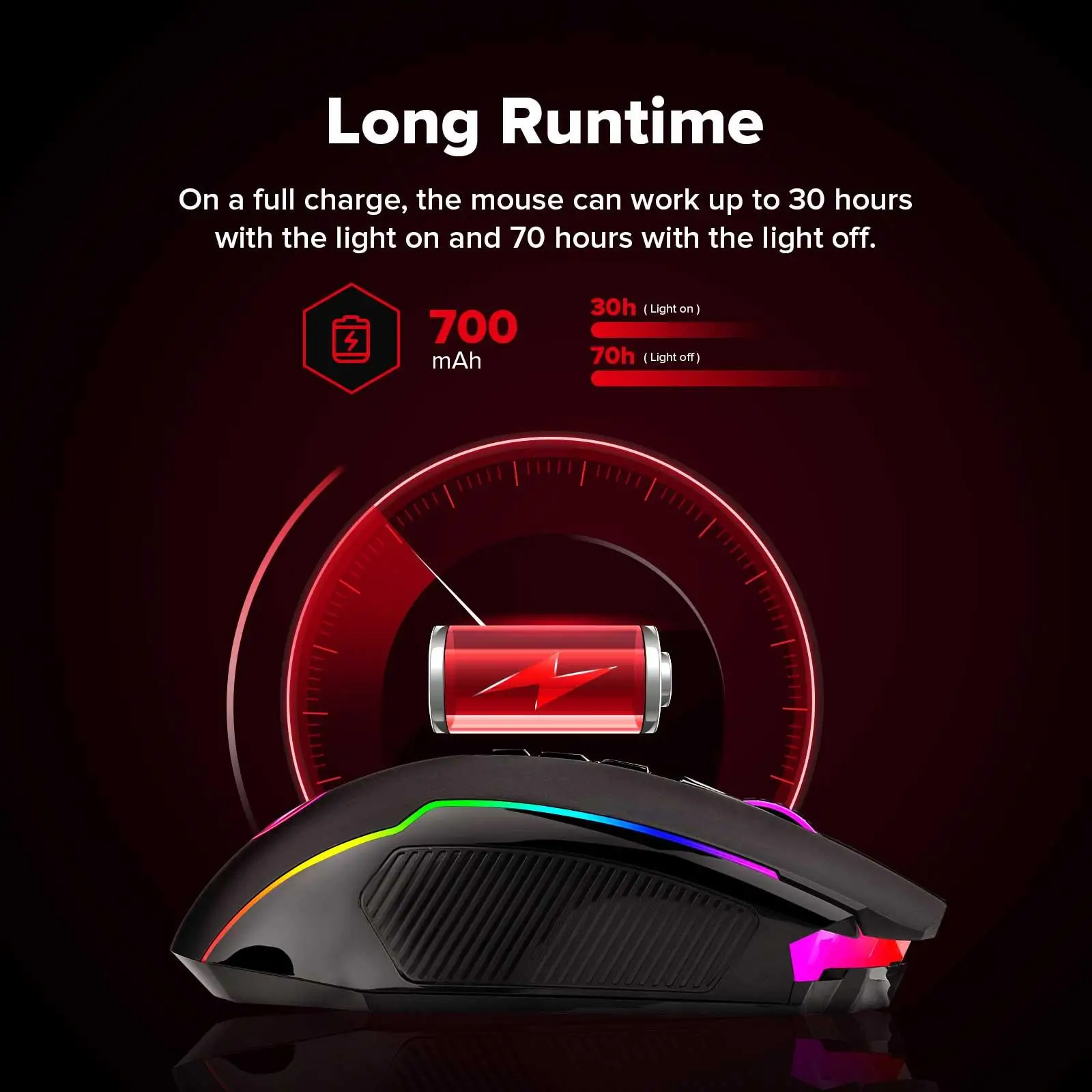 Buscas la perfección a la hora de jugar, con la máxima comodidad y respuesta, pues acá una solución, con este increíble Mouse Gamer modelo Ranger Lite el cual cuenta con iluminación RGB de 7 colores, su modo de uso es vía cable o inalámbrico, posee 9 botones completamente programable y 1 adicional para disparo rápido, tiene 5 niveles de DPI con indicadores de color los que van desde los 500 hasta los 8.000 DPI, 100% recargable, incluye una batería de 700 mAh que puede durar entre 30 a 70 horas, en caso de no estar siendo utilizado cuenta con un sistema de suspensión automática por inactividad.