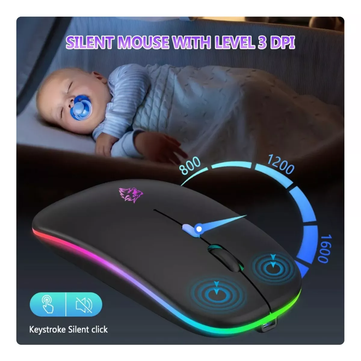 Mouse Inalámbrico, recargable y silencioso, esta versión cuenta con luces Led RGB de 7 colores a elegir y un diseño moderno y ergonómico. Posee una conexión dual de Bluetooth 5.0 y USB 2.4 Ghz, con un alcance de hasta 10 metros. Posee 3 niveles de DPI a velocidades ajustables de 800, 1200 y 1600.